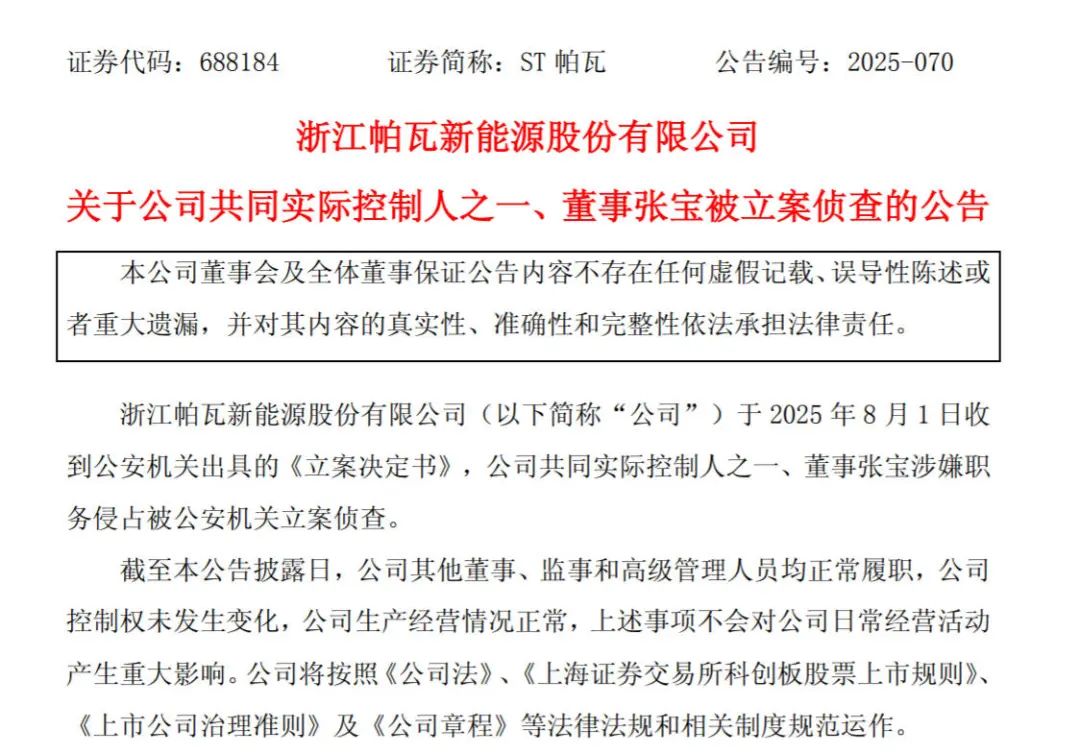 8月3日,st帕瓦(688184)公告称,公司8月1日收到公安机关出具的《立案决定书》,公司共同实际控制人之一、董事张宝涉嫌职务侵占被公安机关立案侦查。目前,公司其他董事、监事和高级管理人员均正常履职,公司控制权未发生变化,生产经营情况正常。