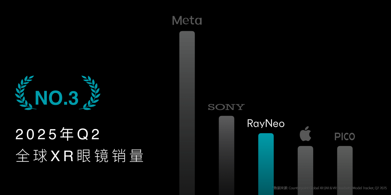 2025年被认为是智能眼镜走向大众市场的关键一年。根据第三方机构Counterpoint Research数据,2025年第二季度,雷鸟创新以39%的市场份额,登顶全球AR眼镜市场第一,并且超越了苹果,成为了全球XR市场(含VR头显和AR眼镜)第三。