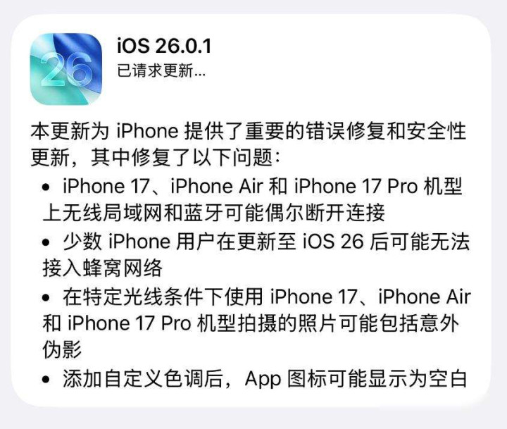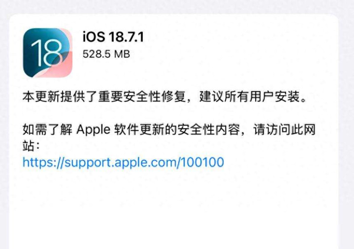 苹果在2025年10月初悄悄发布了两个更新,一个是iOS 26.0.1,给iPhone 16和17用的,另一个是iOS 18.7.1,专门给iPhone 11、12这些老机型用的,两个版本都没加新功能,全都是修漏洞,但服务的人不一样。