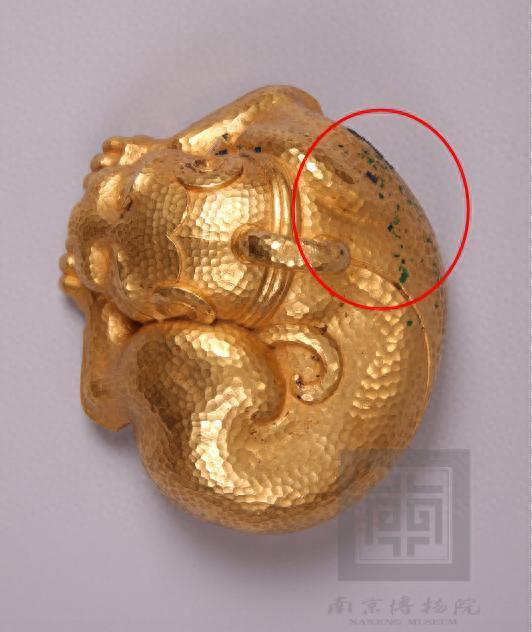 南京博物院官网简介显示,金兽长17.5厘米、宽16厘米、高10.2厘米。1982年出土于江苏省盱眙县南窑庄窖藏。年代最晚可追溯至西汉。整体造型屈腰团身,神态警觉,空腹厚壁,浇铸成形,通体锤饰圆形斑纹。腹内部刻有“黄六”二字。金兽含金量99%,重9100克,是目前我国出土古代黄金铸器中最重的一件,被称为“镇护之宝”。上游新闻记者注意到,官网配图亦可见金兽右腿上方大块黑斑及小块绿色斑点。